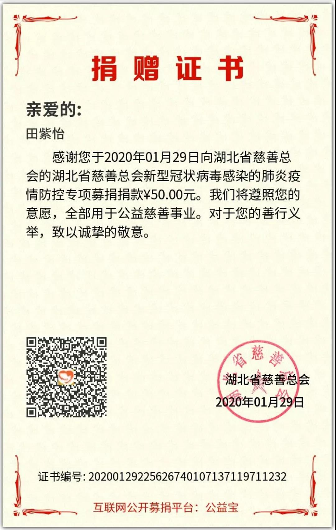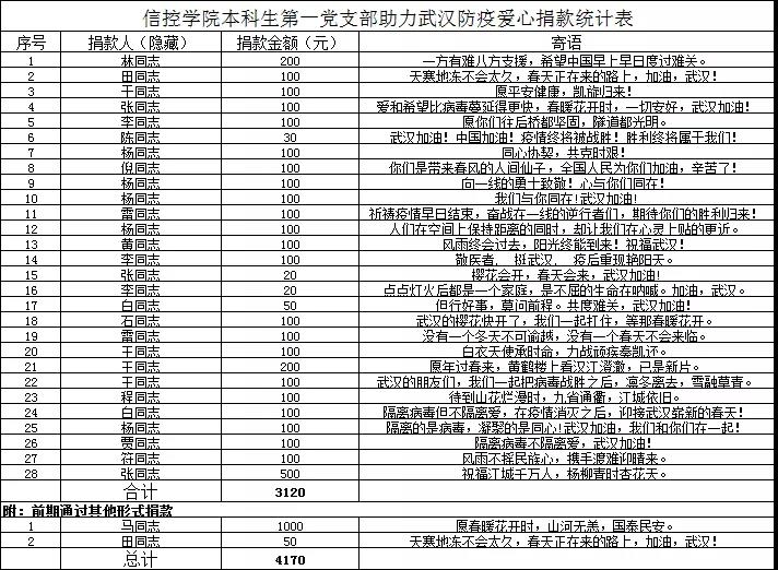 2月13日,Ray竞技官网本科生第一党支部在支部书记张雨明同志的发起下,向全体支部成员发出募捐倡议,帮助武汉同胞早日战胜疫情。募捐自2月13日下午5:23发起至2月14日下午6:14截止,党支部29名成员共计捐款3120.00元,累计前期其他形式捐款,总计捐款金额为4170.00元。本次募捐所有金额均用于新冠肺炎疫情防控,并以雷电竞官方网站Ray竞技官网本科生第一党支部的名义于2月14日晚捐献至湖北省慈善总会。