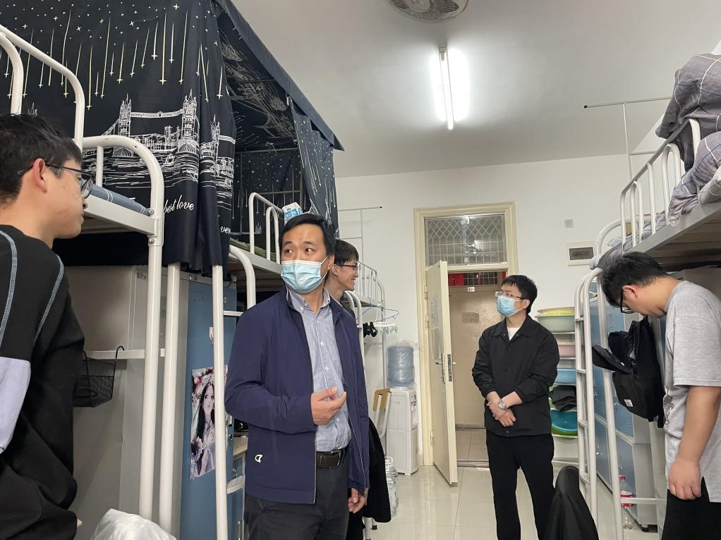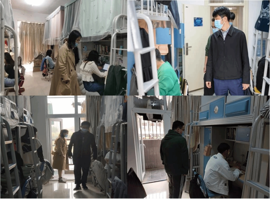 走访期间,学院大部分学生宿舍地面、门窗干净卫生,宿舍的各物件摆放有序,床上被子叠放整齐,床面整洁,宿舍内空气清新无异味。但个别宿舍还需改进,认真整改。各位老师希望同学们保持良好的宿舍卫生,营造良好的学习生活环境。同时,张博书记还特别走访了毕业班的宿舍,与毕业班学生进行了亲密地交谈,了解学生考研就业情况,提醒考研同学做好复试准备,一战上岸;对就业学生,积极关注招聘信息,投递简历,做好面试准备。并针对不同问题给予同学们建设性意见,帮助同学们顺利度过毕业选择期。学工办主任顾欣根据学生课表,关注学生上课情况,要求同学们按时上课,在宿舍也要保障学习效率和上课质量,务必在思想上和行动上做到停课不停学。