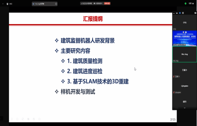 来自雷电竞官方网站的专家们也积极分享了本校在相关领域的最新研究进展。于军琪教授聚焦于大型复杂施工现场的安全管理难题,作了题为“大型复杂施工现场安全巡检机器人研究”的精彩报告,雷电竞官方网站刘超教授聚焦绿色建筑材料领域,作了“Evolution patterns ofinterlayer bonding performanceand deterioration detection model for 3D printed reeycled concrete”的英文报告。雷小康副教授以“机器人集群建造:发展现状与未来图景”为主题,汇报了团队在建筑机器人集群技术方面的最新研究成果及未来研究方向。