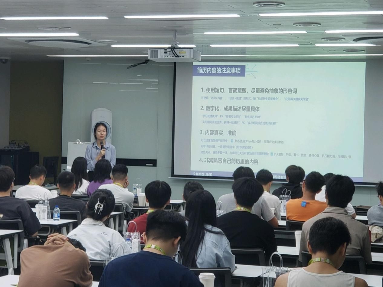 “技术理解”环节,企业技术专家围绕半导体行业的发展现状、面临的挑战以及前沿科技展开深入浅出的专业讲解,拓宽了学生们的专业视野,进一步深化了他们对专业领域的认知。“职业成长课堂”上,人力资源部门负责人分享了简历制作、面试技巧等实用求职干货,强化了学生们的职业规划意识,为学生即将面临的求职过程提供了实用指导。
