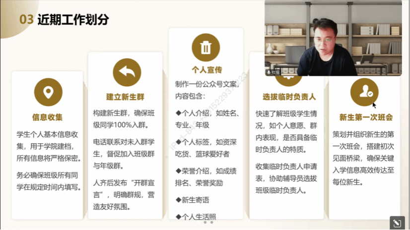 杜瑶与班级助理们聚焦迎新准备、入学教育、日常沟通、学风建设、团队凝聚等方面加以补充强调。要求班级助理要以身作则,在各个方面树立榜样;要耐心细致,用真诚和热情对待每一位新生;要及时沟通,遇到问题第一时间向辅导员反馈。各位班级助理认真聆听、详细记录,并表示会以饱满的热情和负责的态度投入到新生工作中。