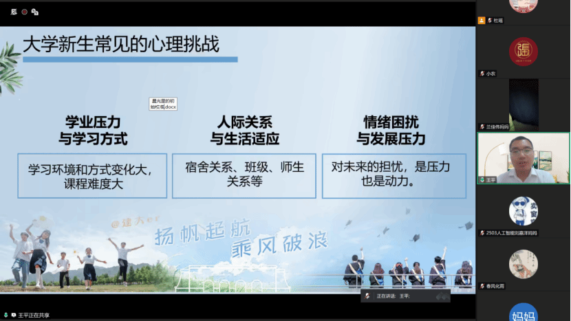 王平针对大学生心理健康教育工作进行专题讲解。他结合当代大学生常见的心理适应问题,分析了新生入学后可能面临的环境适应、人际关系、学业压力等心理挑战,介绍了学校心理素质拓展与咨询中心的服务内容、预约方式及危机干预机制,引导家长正确看待学生心理问题,鼓励家长与学校携手,共同为学生营造积极健康的心理成长环境