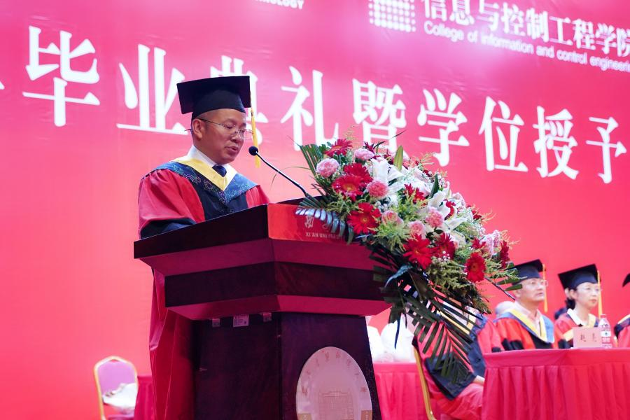 典礼仪式在庄严的国歌声中拉开序幕。院长马宗方亲切致辞,首先向历经拼搏、战胜疫情考验,顺利毕业的345名本科生、96名硕士研究生表示祝贺,向毕业生的父母、老师致以衷心的感谢和崇高的敬意。在同学们即将离开母校之际,马宗方向全体毕业生提出三点希望:一是不忘初心,厚植家国情怀,希望同学们在平凡的岗位铸就不平凡的人生,坚定不移听党话、跟党走。二是砥砺奋斗,书写无悔青春,希望同学们在国家新基建、新城建等信息化、智能化的浪潮中,大有作为,用青春的智慧和奋斗的汗水书写无悔青春。三是珍惜时光,永葆积极心态,希望同学们坚信努力一定会有回报,培养大气格局、甘于奉献,体会人生的丰富多彩、宏伟壮丽。