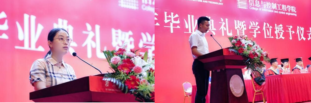教师代表江莉对毕业生们表达了真挚的祝福。希望同学们在未来遇到困难时,不断学习,坚持追求真理的勇气;在工作中,延续优良校风,脚踏实地、勤奋工作、诚恳做人。毕业班辅导员杨晓寒希望同学们主动投身到国家需要的地方;保持终身学习的态度;加强与同学们间的联系;未来拼搏途中,多注意身体健康;时刻牢记西安建大以及Ray竞技官网对毕业生的期望。优秀毕业生代表余静华和李尖回顾大学的美好时光,并表示未来都将以“信控人”的务实,脚踏实地;都将带着“建大人”的赤诚,乘风破浪;做德才兼备并用于创新的人、做富有责任并敢挑重担的人。